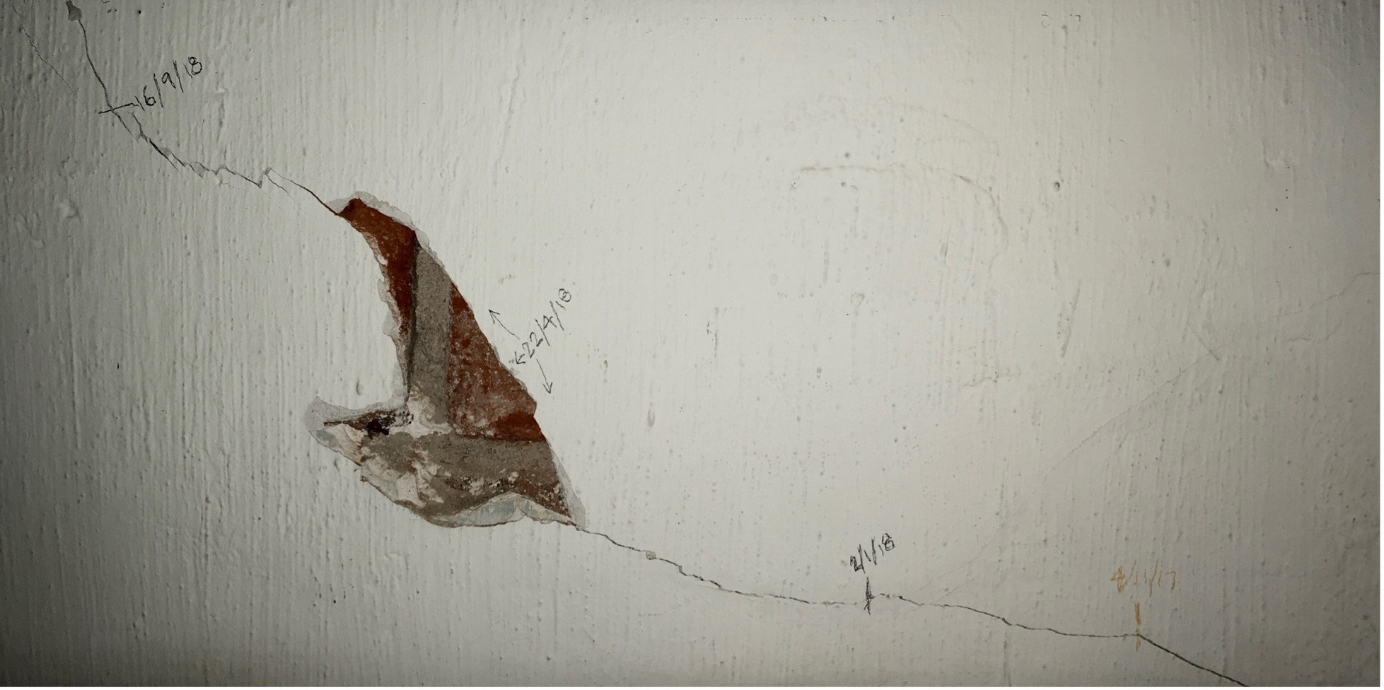 Worried now, she began marking other cracks around her apartment every couple weeks; her neighbors did the same, corroborating that their building was indeed in motion. By the time I visited, the cracks were dated several times. Elena’s fear, I wanted to suggest, didn’t come from the crack alone: Her attention to its speed, its temporality, foregrounded her concern that some ongoing process had taken root within the building itself.