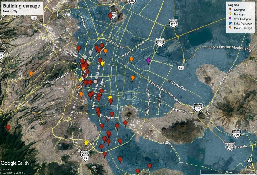 The hollow soil under Mexico City is composed of clay, debris, Mexica ruins and volcanic rock, which causes the surface layers to subside at different rates and locations. Many parts of the city, but especially the eastern margins of Tláhuac and Iztapalapa, sink into the soft earth at a rate of almost a foot a year. When regions with differential rates of subsidence abut one another, they form “grietas,” or fissures. They are especially common in the central and eastern parts of the city, where they split roads down the middle and cut into the foundations of buildings. These grietas fracture violently during earthquakes, while the loose soils elsewhere liquefy, following the ancient waterways and amplifying the seismic waves beyond the tremor that produced them.